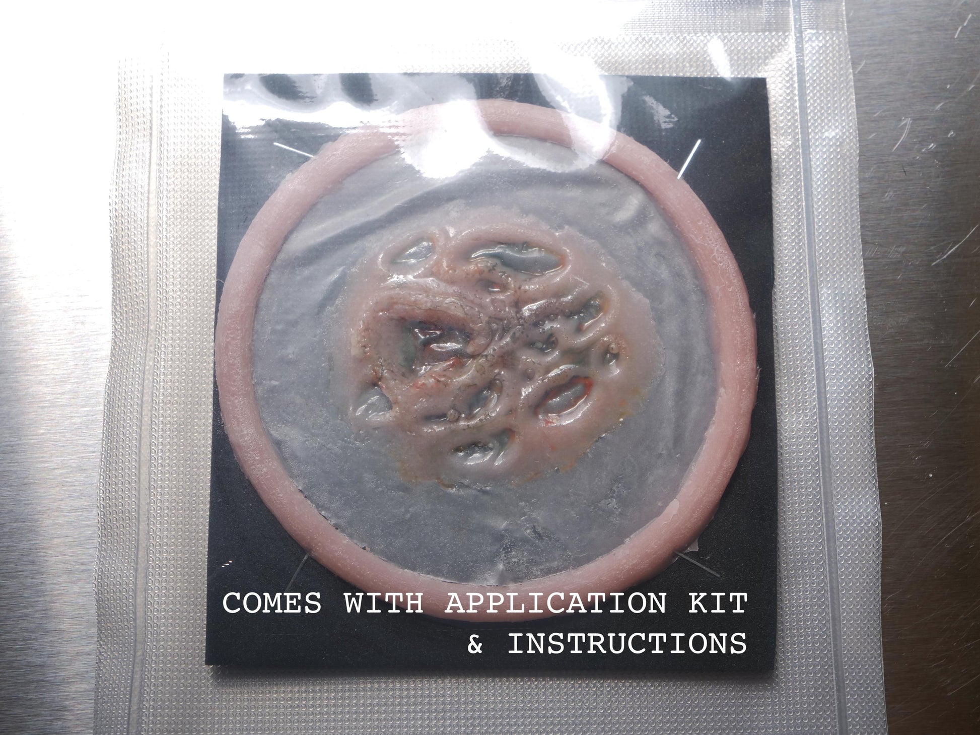 Hand-cast in professional-grade prosthetic material, each unit is airbrushed and hand-painted to ensure natural irregularity in tone and structure, replicating the randomised patterns of real biological decomposition. The surface finish includes moisture-affected tissue glossing and subtle depth shading for maximum realism under cinematic lighting.